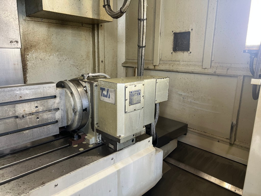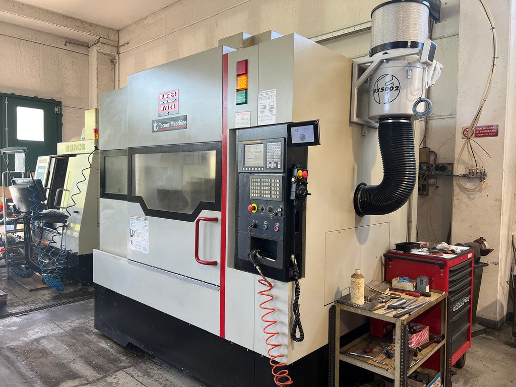 Il centro di lavoro verticale 4 assi QUASER MV 184 C usato è un centro verticale a controllo numerico di medie dimensioni con struttura in ghisa, con guide (a rulli) di scorrimento per la tavola; corse X 1020, Y 610, Z 610 mm, dimensioni tavola 1200×600 con carico massimo di 500Kg., completo di 4 asse in continuo TJR HR 255N con relativa contropunta e piano fresato con cave a T;