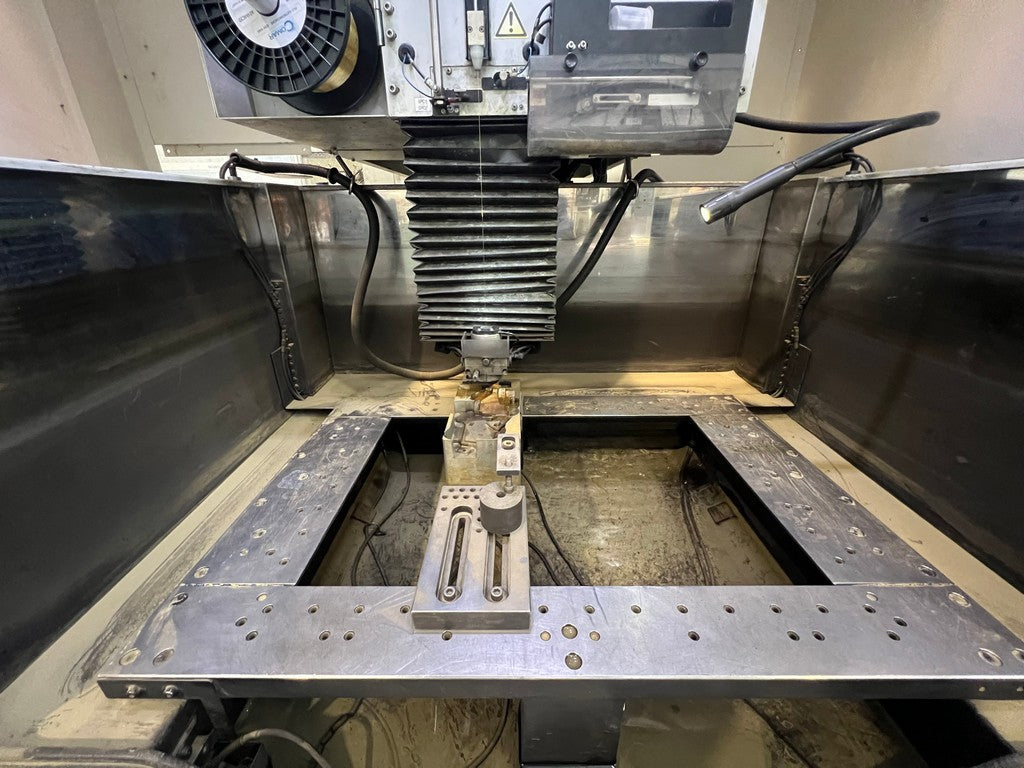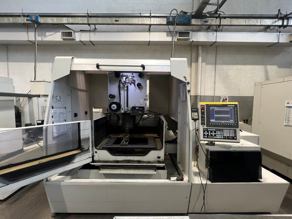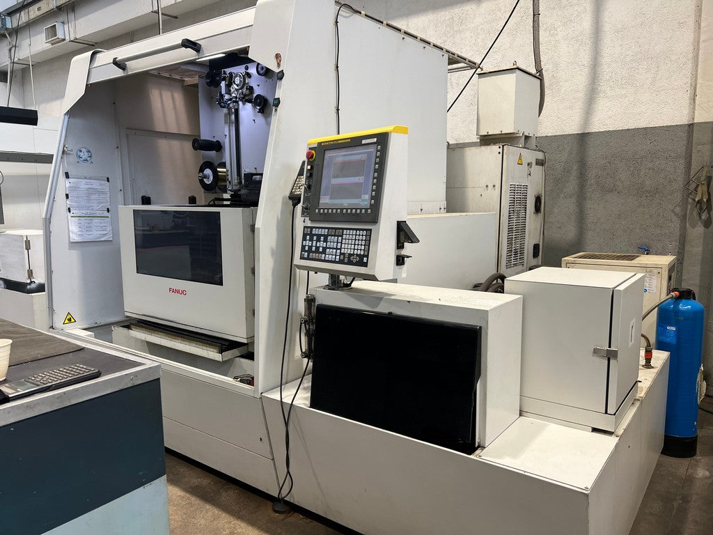 L’ elettroerosione a filo FANUC ALFA 1-iD usata è una erosione a 5 assi a controllo numerico di medie dimensioni con lavorazione ad immersione; corse X 600, Y 400, Z 410 mm; anno di costruzione 12/2007 (installata 2008), a norme CE, completa di infilaggio automatico del filo, frigorifero.
