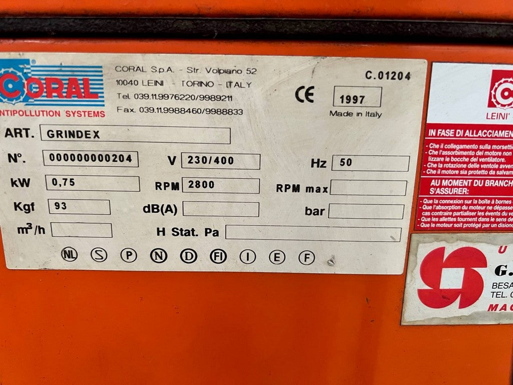 Il filtro aspiratore per polveri di molatura a secco CORAL Grindex usato è depuratore meccanico a bassa rumorosità e a ingombro ridotto, studiato appositamente per l’aspirazione di polveri di molatura a secco, (come ad esempio l’affilatura utensili con mola) e dove esista la possibilità di trasporto di particelle incandescenti che potrebbero danneggiare i filtri, e in grado di contenere il rischio incendio.