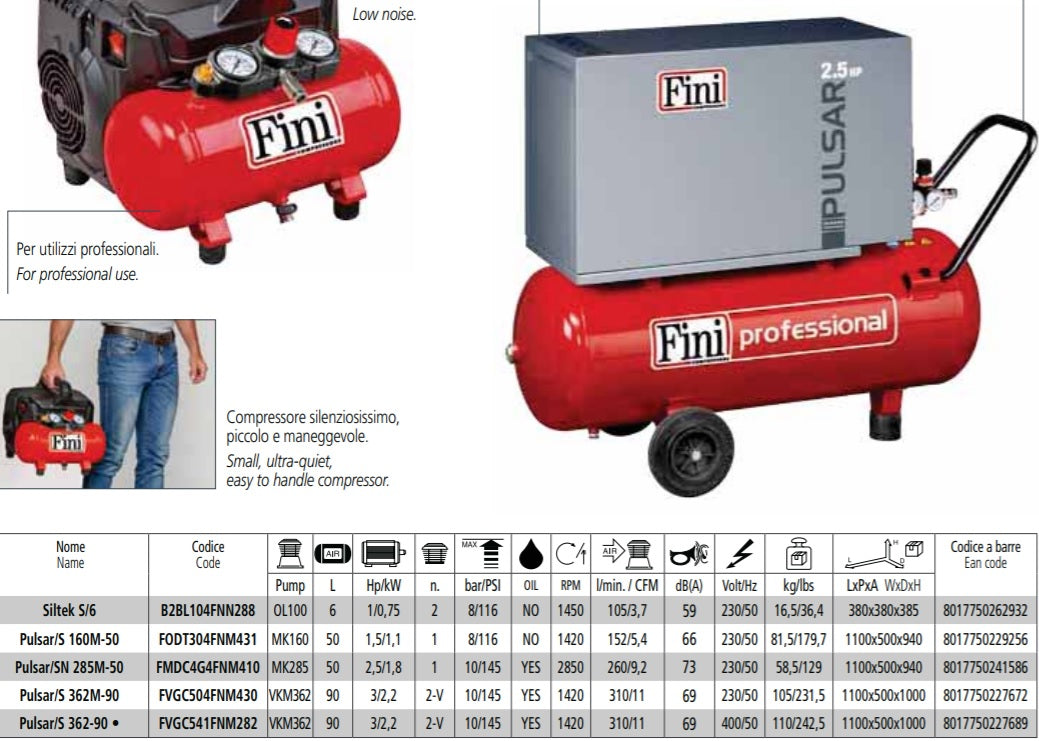 Il compressore silenzioso professionale FINI PULSAR S 362T 100 usato è un compressore a pistoni con una potenza di 3CV,  e serbatoio aria da 100Lt.; a norme “CE”, anno 2001, alimentazione 380V trifase.