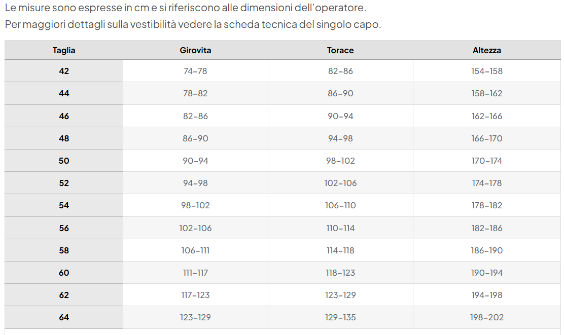 TAGLIE DISPONIBILI