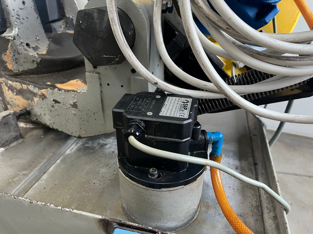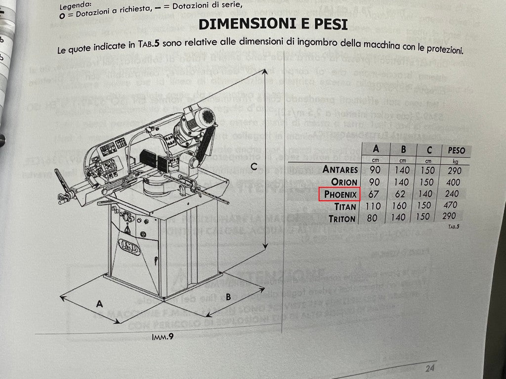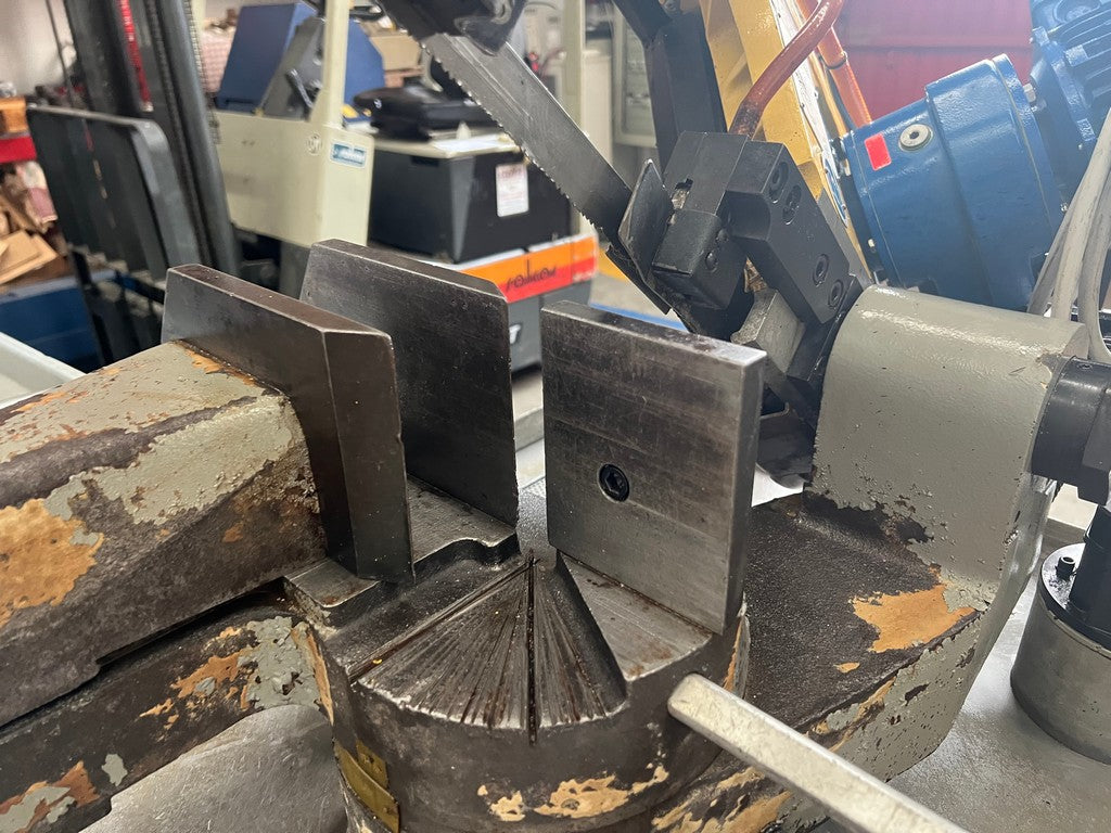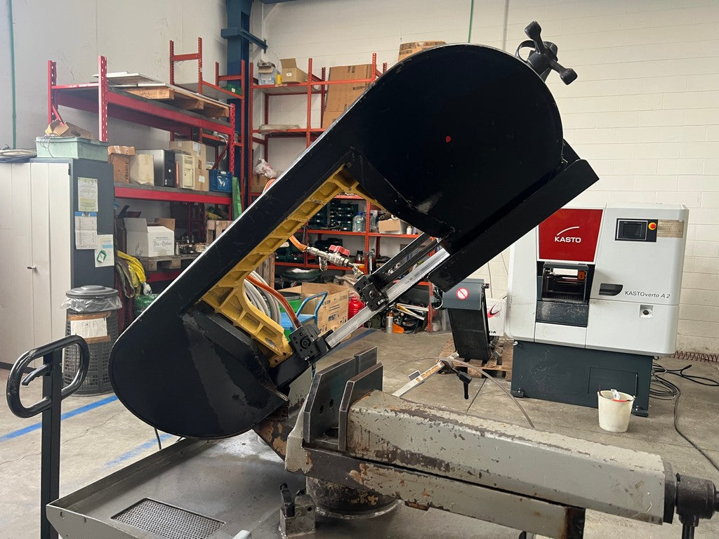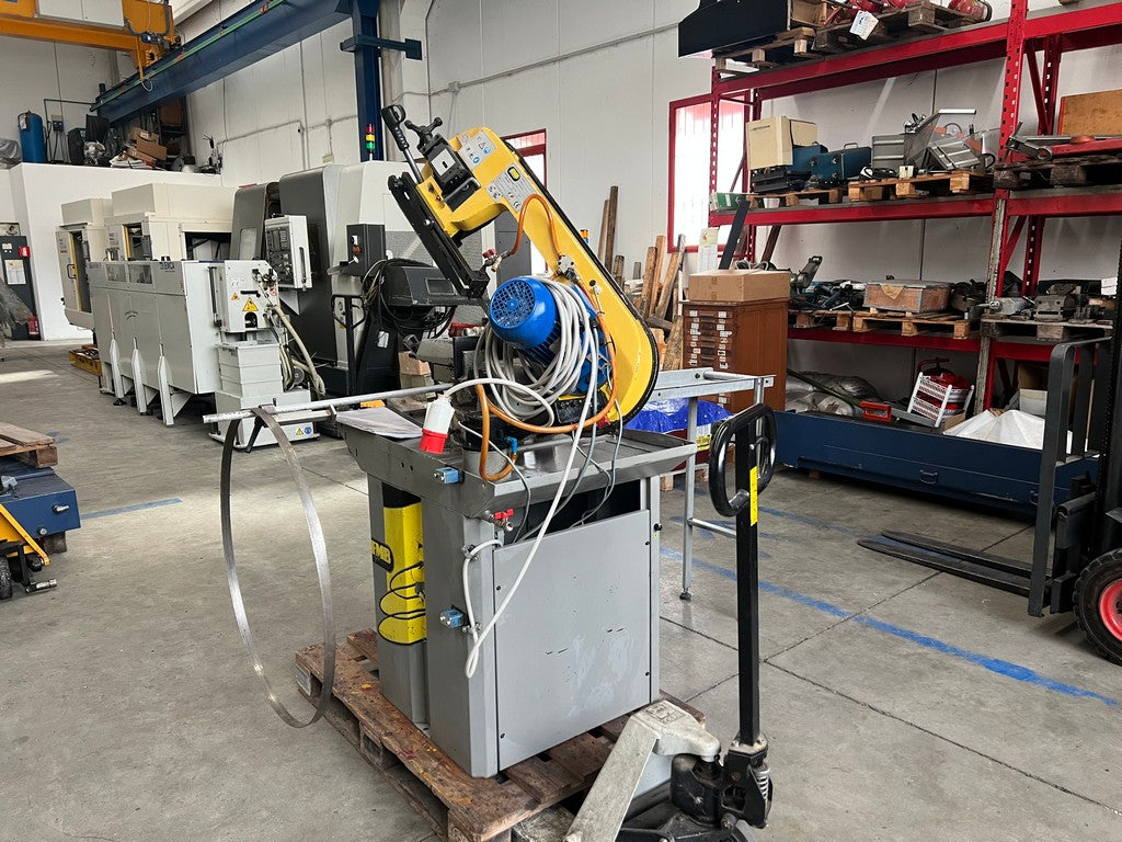 La segatrice a nastro FMB PHOENIX usata è una segatrice manuale a discesa manuale di costruzione Italiana dotata di una solida morsa in ghisa con avvicinamento manuale e bloccaggio rapido del pezzo a leva, rotazione arco con fermi di battuta a 0°, 45° e 60°, max dimensioni di taglio tondo 220mm, piatto 130×250 o 215x230mm.