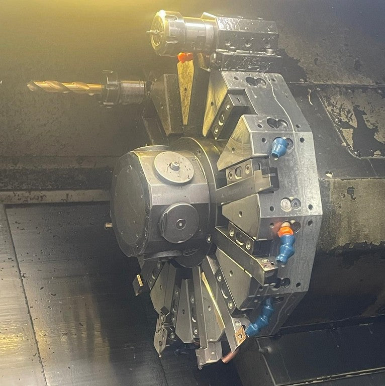 Completa di autocentrante idraulico AUTOBLOCK da 210mm, presetting utensili, contropunta programmabile, 2 portautensili motorizzati (1 assiale ed 1 radiale), evacuatore trucioli, set portautensili fissi e manuali e disco backup; Anno di costruzione 1997; macchina a norme “CE”, in ottime condizioni.